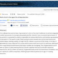 « Dans un article d'Ignas Kalpokas qui s'appelle "Work of Art in the Age of its IA Reproduction" (2023), il défend que l'image artificielle rend visible ce qui est sous-jacent dans la société contemporaine. C'est-à-dire, les interrelations récursives entre les données issues des multiples téléchargements d'Internet et des interactions que nous effectuons nous-mêmes en ligne. Ce qu'il défend, c'est que ces artefacts numériques révèlent notre vie contemporaine de façon singulière ou authentique. »