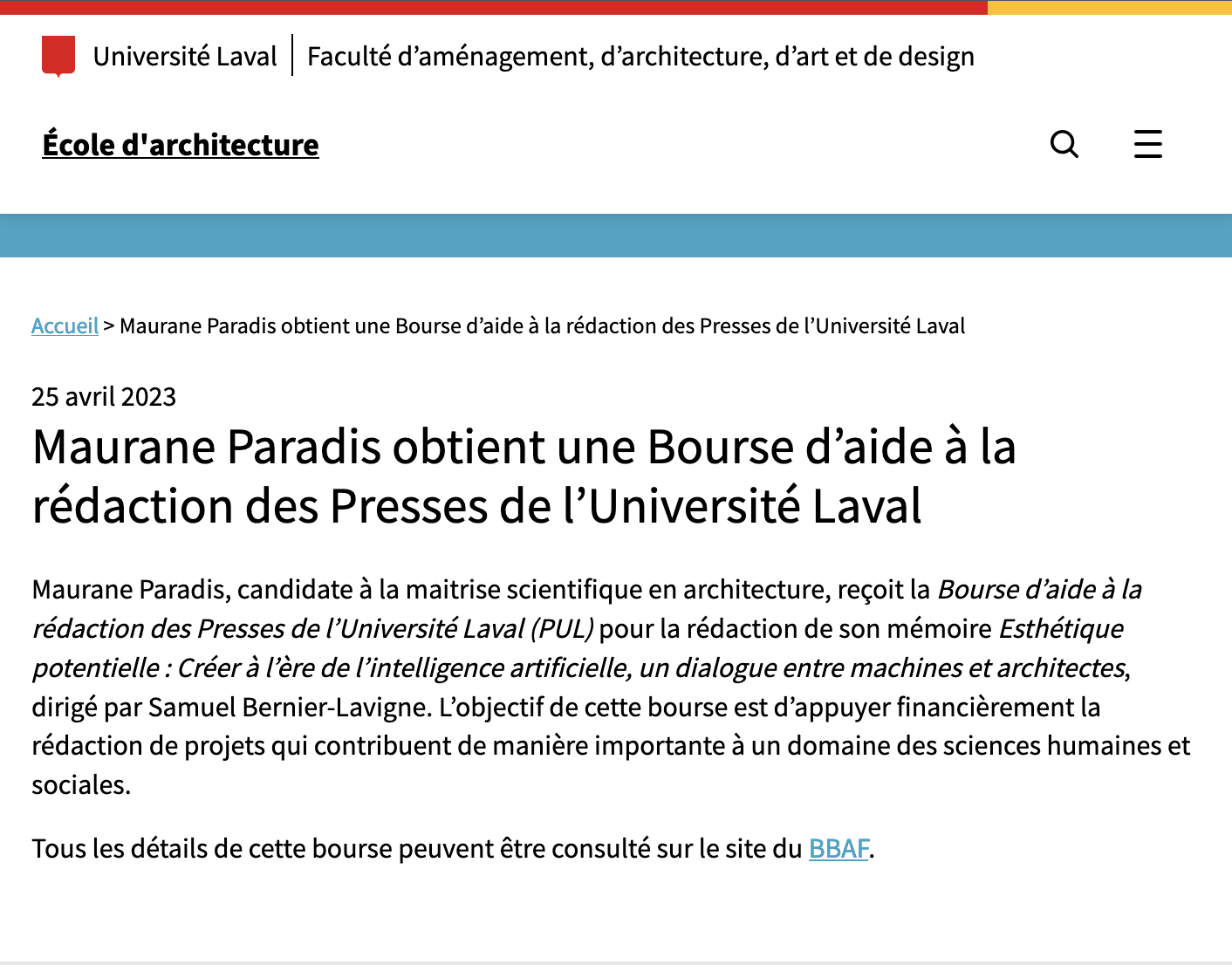 - Maurane Paradis, candidate à la maitrise scientifique en architecture, reçoit la Bourse d’aide à la rédaction des Presses de l’Université Laval (PUL) pour la rédaction de son mémoire Esthétique potentielle : Créer à l’ère de l’intelligence artificielle, un dialogue entre machines et architectes, dirigé par Samuel Bernier-Lavigne. L’objectif de cette bourse est d’appuyer financièrement la rédaction […]