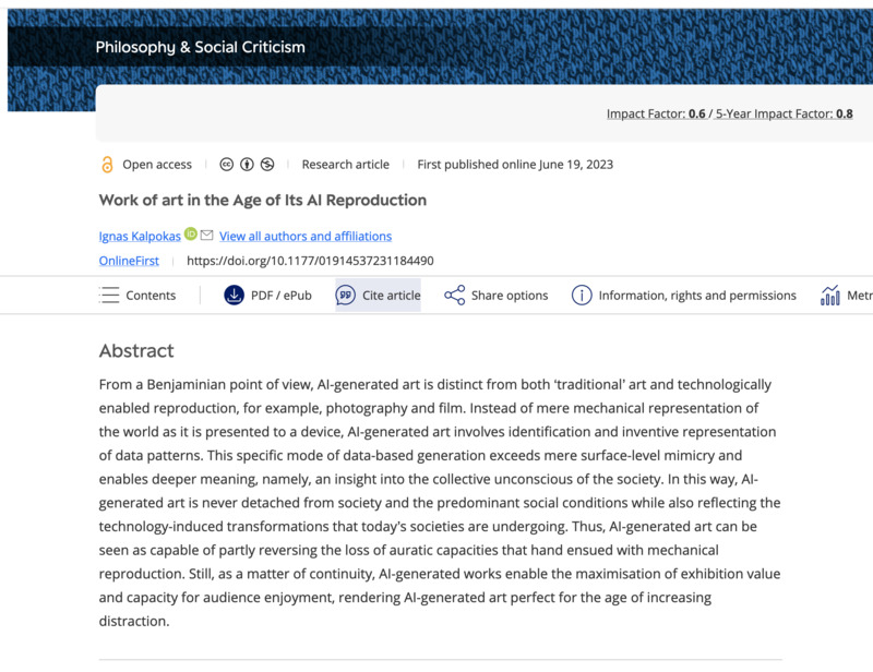- From a Benjaminian point of view, AI-generated art is distinct from both ‘traditional’ art and technologically enabled reproduction, for example, photography and film. Instead of mere mechanical representation of the world as it is presented to a device, AI-generated art involves identification and inventive representation of data patterns. This specific mode of data-based generation exceeds mere surface-level mimicry and enables deeper meaning, namely, an insight into the collective unconscious of the society. In this way, AI-generated art is never detached from society and the predominant social conditions while also reflecting the technology-induced transformations that today’s societies are undergoing. Thus, AI-generated art can be seen as capable of partly reversing the loss of auratic capacities that hand ensued with mechanical reproduction. Still, as a matter of continuity, AI-generated works enable the maximisation of exhibition value and capacity for audience enjoyment, rendering AI-generated art perfect for the age of increasing distraction.