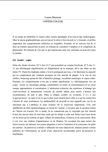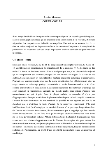 - À l'ère numérique, la copie ne change pas seulement d'échelle, mais aussi de portée stratégique et culturelle. La pratique du copier-coller doit en ce sens être réexaminée pour que soient d'abord distingués le plagiat - favorisé par la disponibilité des ressources et l'efficacité des moteurs de recherche - et les techniques de collecte et de montage - vecteurs d'une dynamique d'appropriation des biens culturels. La dimension technique de la copie doit ensuite être replacée au centre de la performativité numérique. Des diverses formes de copie transitoire, indispensables à la circulation des informations, à la duplication algorithmique des données, qui fait aujourd'hui la loi sur les réseaux, c'est toute l'économie de la publication qu'il faut repenser. Dans ce contexte, plutôt qu'un durcissement du copyright, c'est d'une défense d'un Internet public que nous avons besoin, afin d'endiguer la logique de silos que les grands acteurs du Web appliquent à la gestion du cloud.