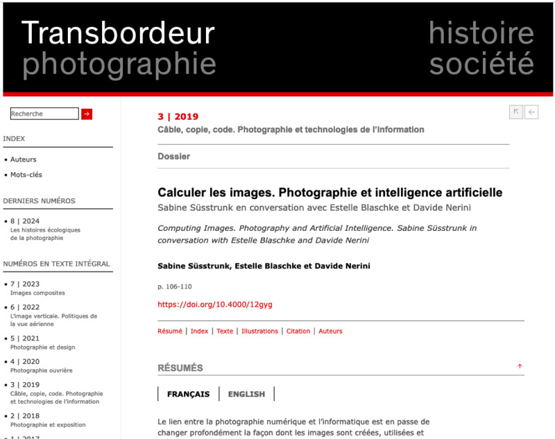 - Le lien entre la photographie numérique et l’informatique est en passe de changer profondément la façon dont les images sont créées, utilisées et perçues. Dans un entretien avec Estelle Blaschke et Davide Nerini, Sabine Süsstrunk, chercheuse en sciences numériques, aborde l’évolution non linéaire vers la « photographie computationnelle » et la vision par ordinateur, cette dernière ayant été alimentée par une production photographique sans précédent et des avancées spectaculaires dans le champ de l’intelligence artificielle.
