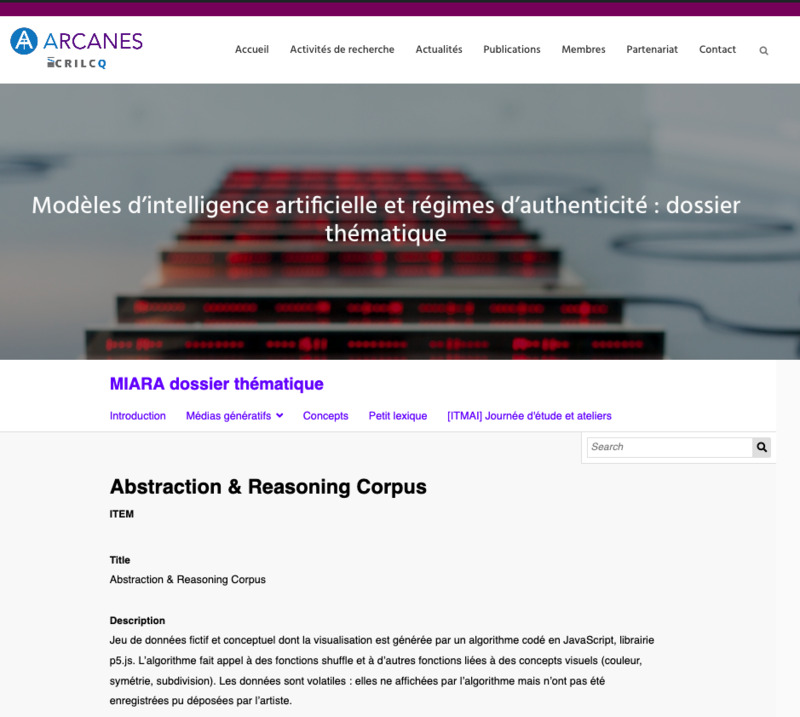 - Modèles d'intelligence artificielle et régimes d'authenticité (MIARA) : dossier thématique. Œuvre média génératif - "Abstraction and Reasoning Corpus" AA Cavia