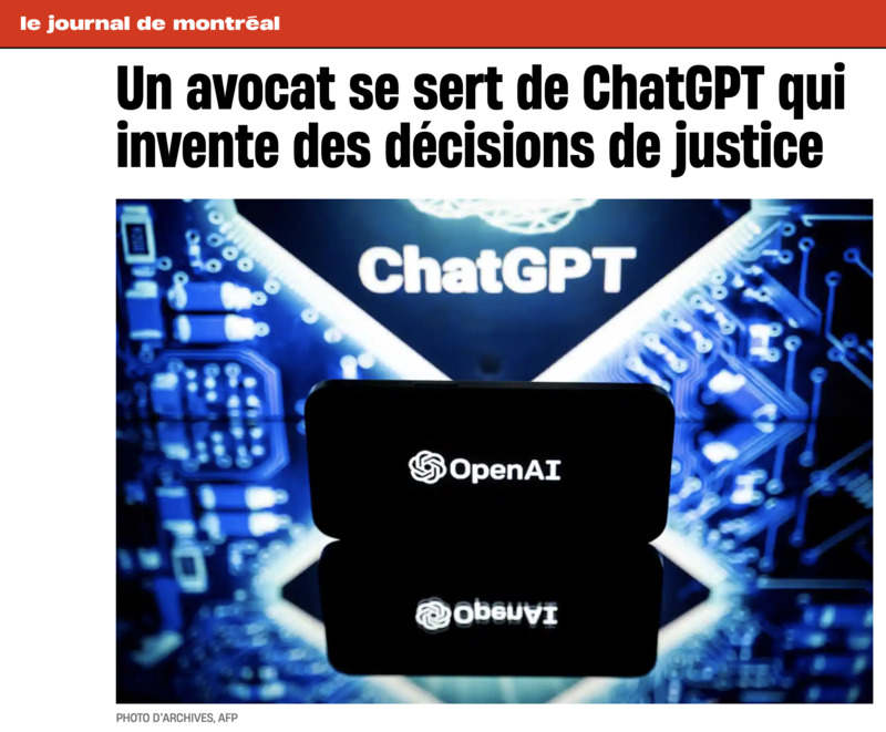 - https://www.journaldemontreal.com/2023/05/27/un-avocat-se-sert-de-chatgpt-qui-invente-des-decisions-de-justice-1