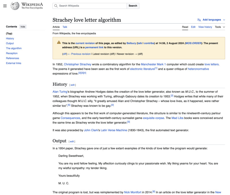 - https://en.wikipedia.org/w/index.php?title=Strachey_love_letter_algorithm&oldid=1238182102
