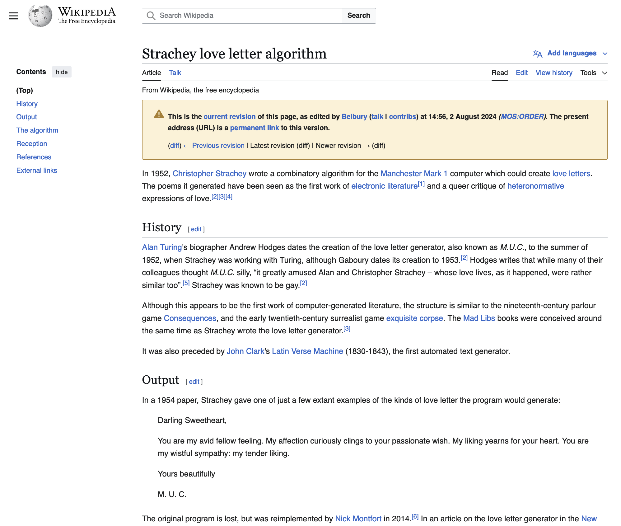 - In 1952, Christopher Strachey wrote a combinatory algorithm for the Manchester Mark 1 computer which could create love letters. The poems it generated have been seen as the first work of electronic literature and a queer critique of heteronormative expressions of love.
