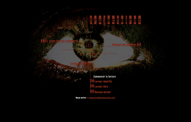- Trajectoires constitue une adaptation sur Internet des générateurs de textes littéraires, conçus par Jean-Pierre Balpe. Les textes ne sont pas pré-écrits, mais les mots sont combinés, en temps réel, à partir de 96 logiciels d'écriture automatique et interactive capables d'engendrer les pages d'un roman sans fin, tout en ne laissant pas deviner leur origine informatique. Le lecteur est sollicité à construire son propre roman. Au niveau du schéma de la communication, les rôles sont changés: le lecteur n'est plus un simple récepteur, sa lecture est active dans la mesure où les choix qui sont faits viennent modifier la suite du roman. S'il était déjà vrai de dire à propos du livre matériel et linéaire que l'acte de lecture est ce qui permet à l'oeuvre d'être, cela s'avère encore plus éloquant dans le cas d'oeuvres hypertextuelles telles que celle-ci, car l'acte de lecture détermine et modifie le texte. Anciennement disponible sous http://trajectoires.univ-paris8.fr/ et http://www.trajectoires.com/, le site n'est malheureusement plus en ligne.