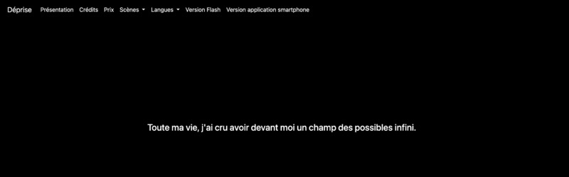 - Déprise est une création sur les notions de prise et de perte de contrôle. Quand a-t-on l'impression d'être en situation de prise ou de perte de prise dans la vie ? Six scènes racontent l'histoire d'un personnage en pleine déprise. Parallèlement, ce jeu sur prise et déprise permet de mettre en scène la situation du lecteur d'une œuvre interactive.