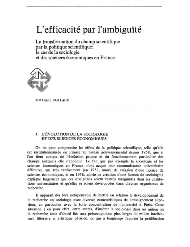 - Les changements intervenus dans le champ scientifique français depuis le début des années 60 ne peuvent être compris indépendamment du développement d'une politique scientifique de plus en plus active. Bien qu'elle ait considérablement altéré le degré d'autonomie du champ scientifique, cette politique n'a pourtant rencontré que peu de résistances de la part des chercheurs. Selon l'auteur, ceci doit être expliqué par le caractère ambigu de cette politique : ambiguïté des caractéristiques sociales des agents qui l'ont promue, ambiguïté aussi du discours tenu et des mesures décidées. L'étude de cas porte sur la sociologie et les sciences économiques.