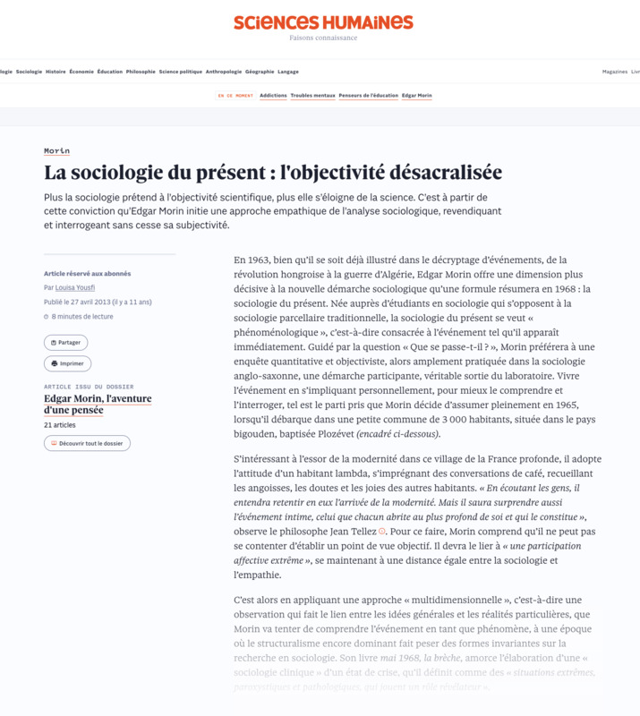 - Edgar Morin, l'aventure d'une pensée : La sociologie du présent : l'objectivité désacralisée