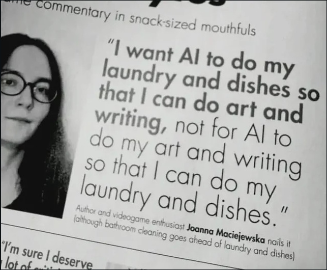 I want AI to do my laundry and dishes so that I can do art and writing, not for AI to do my art ans writing so that I can do my laundry and dishes