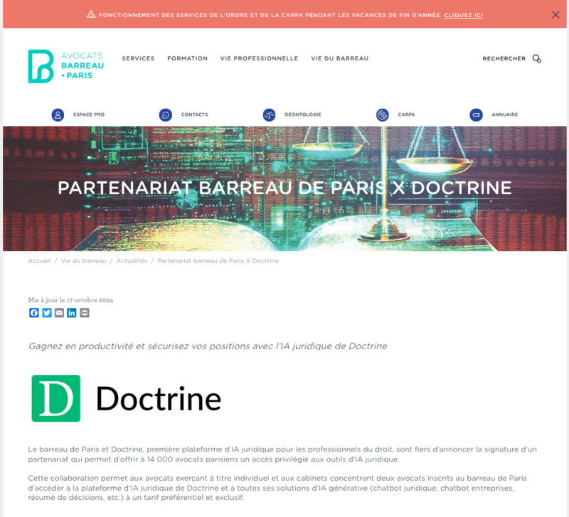 - Le barreau de Paris et Doctrine, première plateforme d’IA juridique pour les professionnels du droit, sont fiers d’annoncer la signature d’un partenariat qui permet d’offrir à 14 000 avocats parisiens un accès privilégié aux outils d’IA juridique.