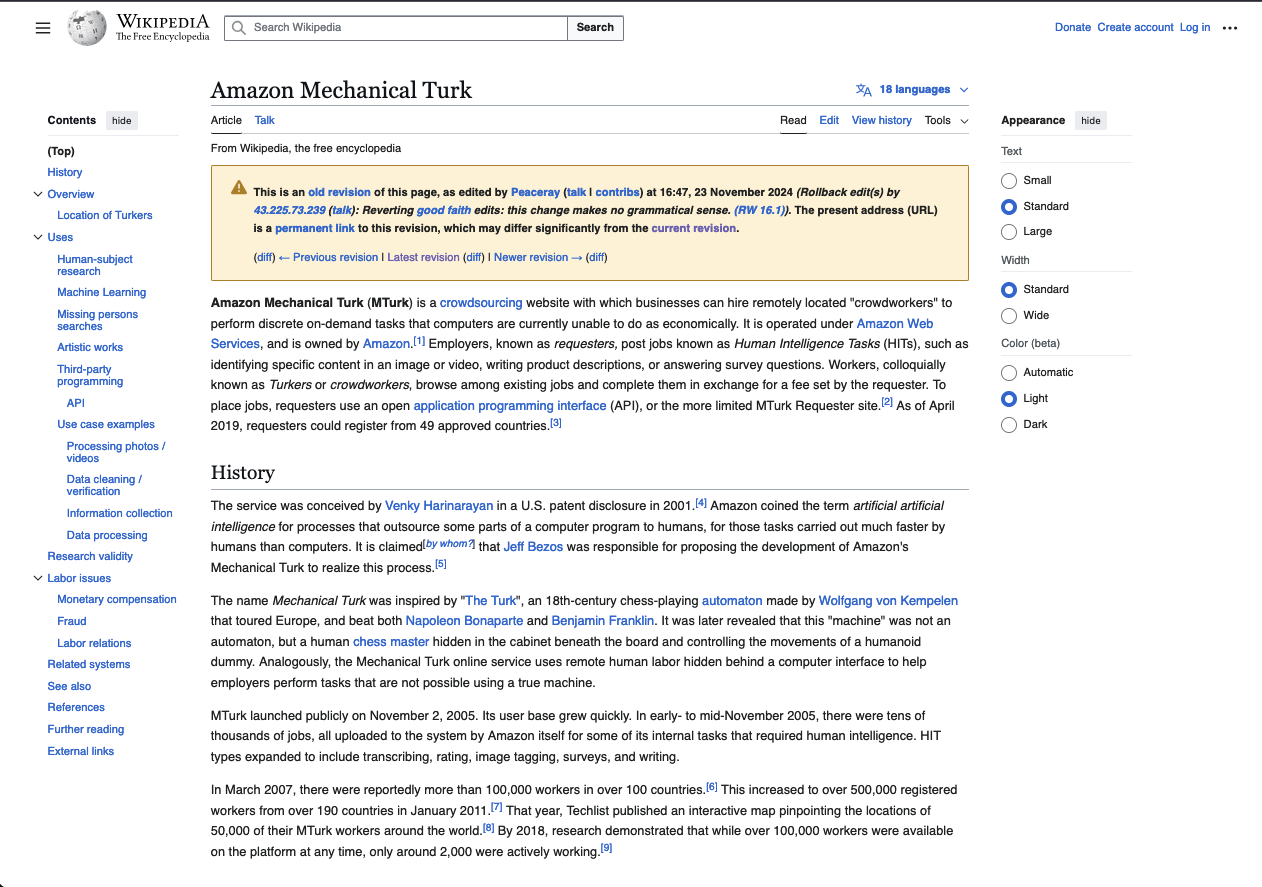 - https://en.wikipedia.org/w/index.php?title=Amazon_Mechanical_Turk&oldid=1259145722