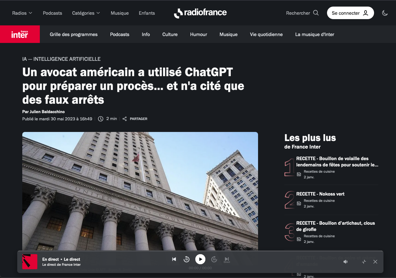 - https://www.radiofrance.fr/franceinter/un-avocat-americain-a-utilise-chatgpt-pour-preparer-un-proces-et-n-a-cite-que-des-faux-arrets-3833906