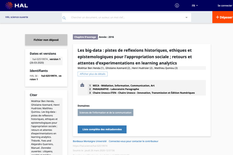 - Les big-data : pistes de reflexions historiques, ethiques et epistemologiques pour l'appropriation sociale ; retours et attentes d'experimentations en learning analytics