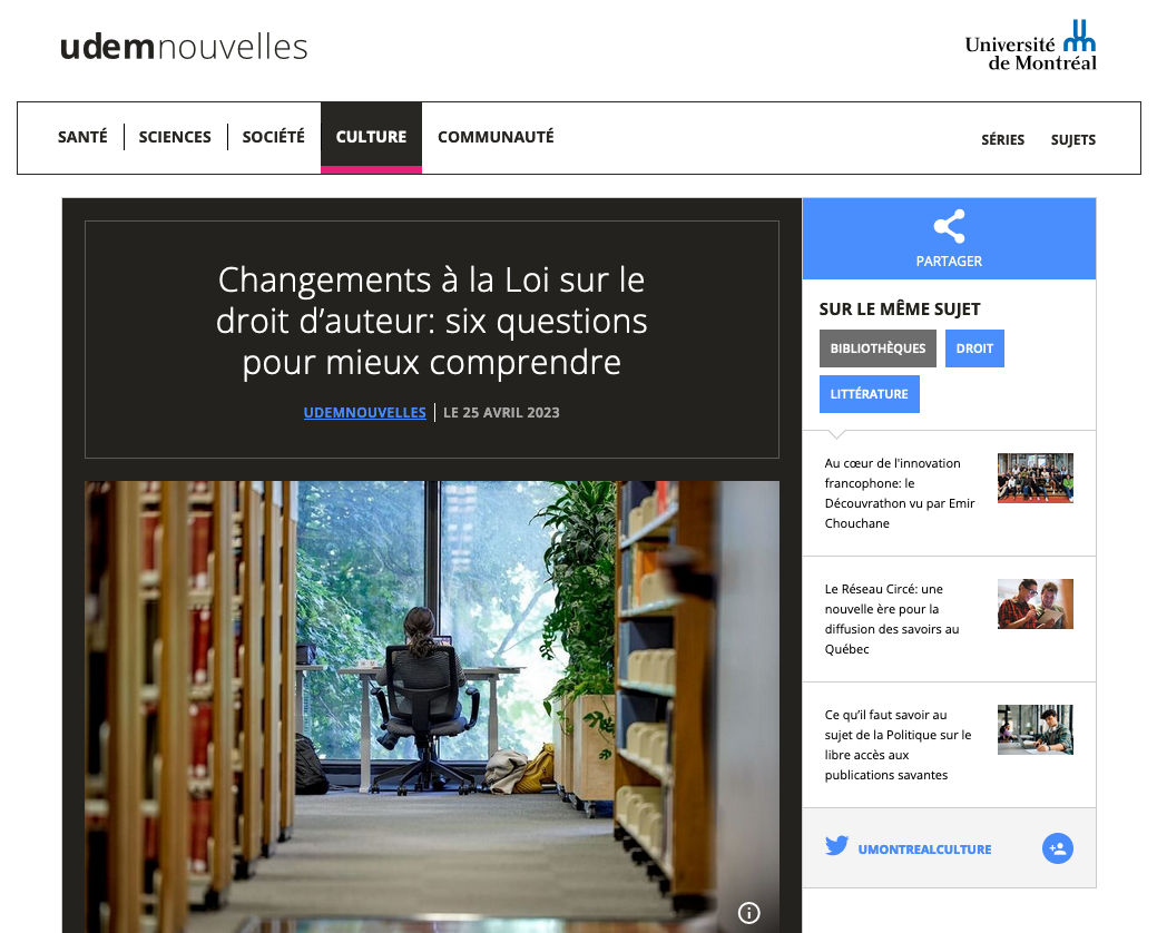 - https://nouvelles.umontreal.ca/article/2023/04/25/changements-a-la-loi-sur-le-droit-d-auteur-six-questions-pour-mieux-comprendre/