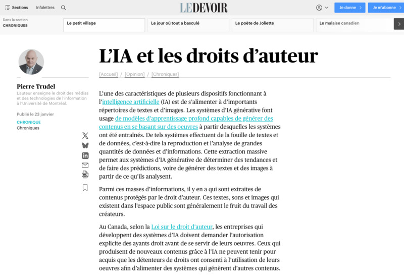 - L’une des caractéristiques de plusieurs dispositifs fonctionnant à l’intelligence artificielle (IA) est de s’alimenter à d’importants répertoires de textes et d’images. Les systèmes d’IA générative font usage de modèles d’apprentissage profond capables de générer des contenus en se basant sur des oeuvres à partir desquelles les systèmes ont été entraînés. De tels systèmes effectuent de la fouille de textes et de données, c’est-à-dire la reproduction et l’analyse de grandes quantités de données et d’informations. Cette extraction massive permet aux systèmes d’IA générative de déterminer des tendances et de faire des prédictions, voire de générer des textes et des images à partir de ce qu’ils analysent.