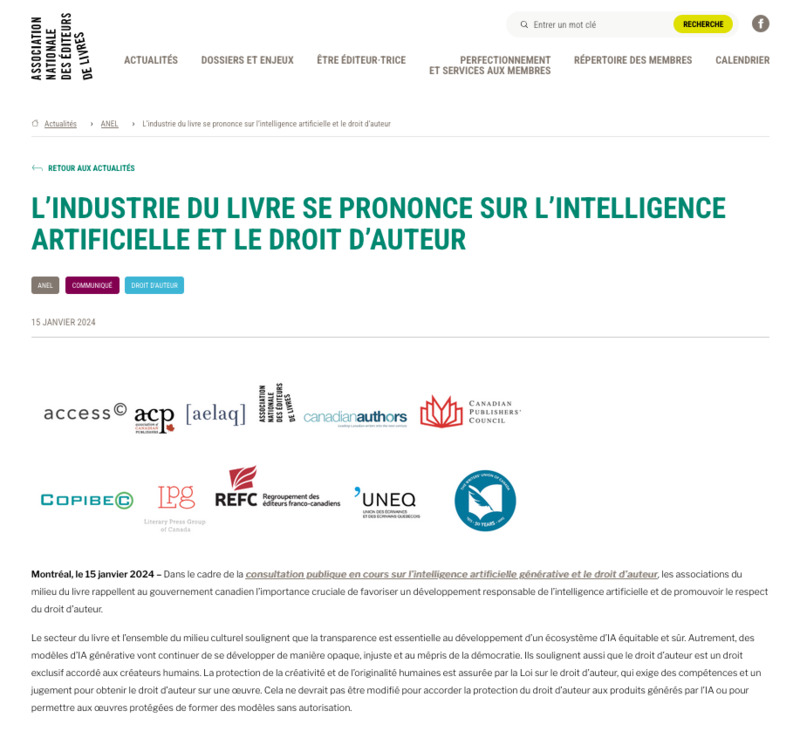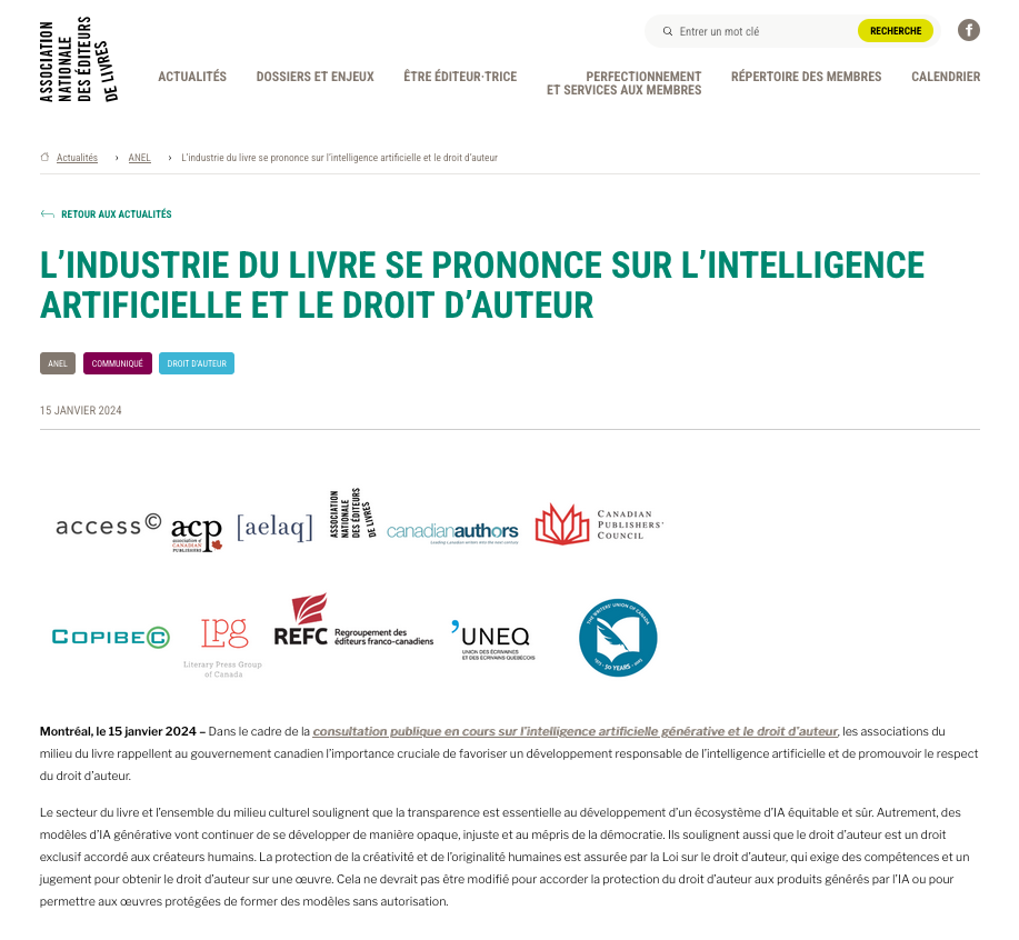 - L’industrie du livre se prononce sur l’intelligence artificielle et le droit d’auteur
