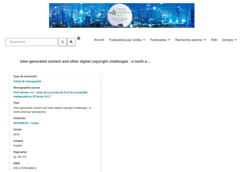 - Cet ouvrage rassemble les contributions consacrées au droit d’auteur à l’ère du numérique et présentées lors de la Journée de Droit de la Propriété Intellectuelle (www.jdpi.ch) organisée le 22 février 2017 à l’Université de Genève. Ces contributions sont: Blocage de sites web en droit suisse : des injonctions civiles et administratives de blocage au séquestre pénal (Yaniv Benhamou) ; Website Blocking Injunctions-a decade of development (Jo Oliver/Elena Blobel); Le marché numérique européen : enseignements de la jurisprudence de la Cour de justice et perspectives règlementaires (Jean-Michel Bruguière) ; User-generated Content and Other Digital Copyright Challenges: A North American Perspective (Ysolde Gendreau) ; Copyright in the Digital Age: A view from Asia (Wenwei Guan) ; Deep Copyright: Up - and Downstream Questions Related to Artificial Intelligence (AI) and Machine Learning (ML) (Daniel Schoenberger).