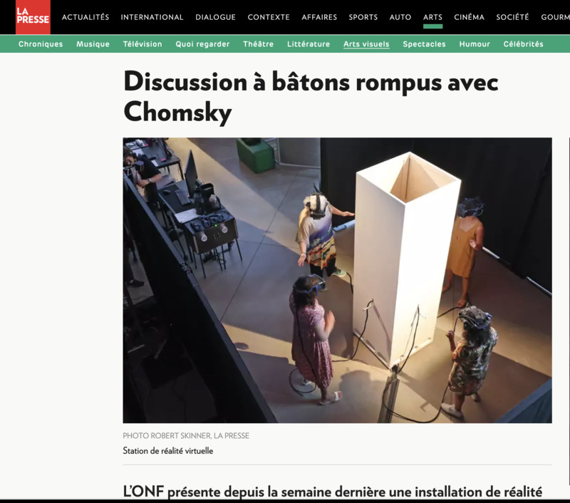- L’ONF présente depuis la semaine dernière une installation de réalité virtuelle (RV) conçue par Sandra Rodriguez, qui permet au visiteur d’entrer en dialogue avec une entité artificielle inspirée du célèbre linguiste américain Noam Chomsky.
