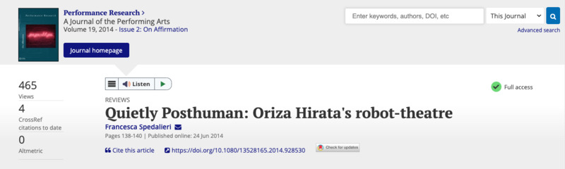 Items with "A comme contenu relié / annoté (ressource physique, actant, conceptuelle): Quietly Posthuman: Oriza Hirata's robot-theatre"