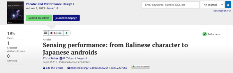 - This article examines recent work in machine performance in the context of an ‘Artificial Life’ research lab, linking the disciplines of visual anthropology, cybernetics, Artificial Life and Deep Learning-based artificial intelligence with the increasing interest in deploying ‘intelligent machines’ in artistic performance settings. As recent explorations of ‘machine vision’ in robotics demonstrate, cameras can be understood as instruments of capture and representation which no longer are simply recorders of images whose meanings are to be unlocked by human interpreters. Moving across a range of performative contexts, from anthropologists Gregory Bateson and Margaret Mead’s ethnographic work in Bali to experiments with an autonomous android in the Japanese lab, the article explores the camera as a cybernetically influenced sensing device that generates complex feedback loops between entities and their spatio-temporal environments. How does the camera as a sensing device enact a kind of visual performativity whereby technologically mediated subjects and selves are not recorded but, in effect, produced through interactive circuits, instruments and computational technologies? How might models of perception and observation that emerge from the social and natural sciences shape new ideas about the entangling of computational and real bodies spaces in the emerging practices of performance design?