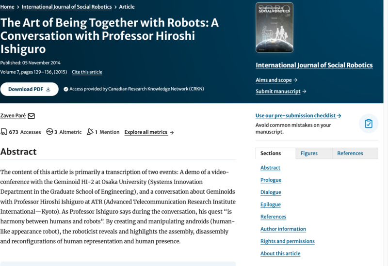 Zotero automatique tagger a taggé le document The Art of Being Together with Robots: A Conversation with Professor Hiroshi Ishiguro avec le tag Human likeness