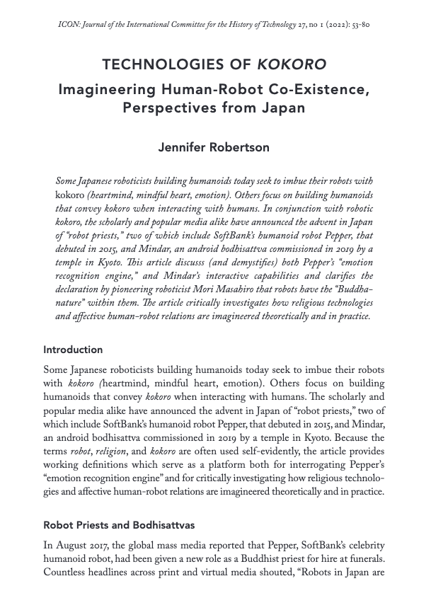 Items with "A comme contenu relié / annoté (ressource physique, actant, conceptuelle): Technologies of Kokoro: Imagineering Human-Robot Co-Existence, Perspectives from Japan"