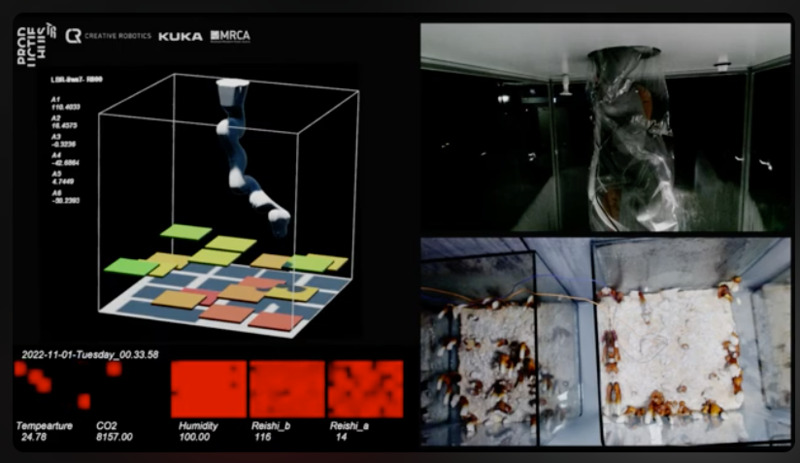 ZOE is a temporary co-existence between the reishi mushrooms and a custom-made robotic system. Noor Stenfert Kroese and Amir Bastani explore with ZOE the possibilities of internal communication between its robotic system and reishi. Within this seeming paradox between nature and technology an ecosystem occurs, that cares for and affects each other through sensing technologies A tactile space of data visualisations is created around ZOE in which visitors can explore ZOE’s outcome.
