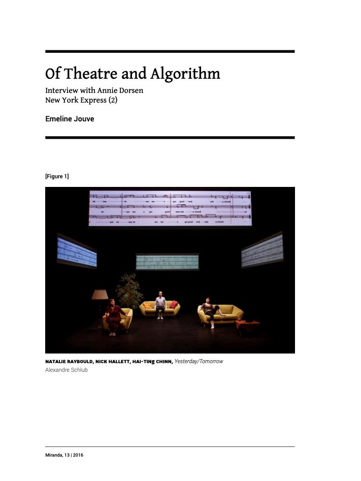 Interview with Annie Dorsen who presented his show Yesterday/Tomorrow at Théâtre Garonne (Toulouse) for the New York Express festival in partnership with PS122. The interview was conducted on November, 28th, 2015 in Toulouse, France.