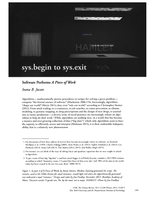 - What happens to theatre in an algorithmically driven world, and what becomes possible when algorithms and the software they constitute are put to work to make theatre? A Piece of Work by Annie Dorsen considers this question an exigent problem to be solved—algorithmically and theatrically.