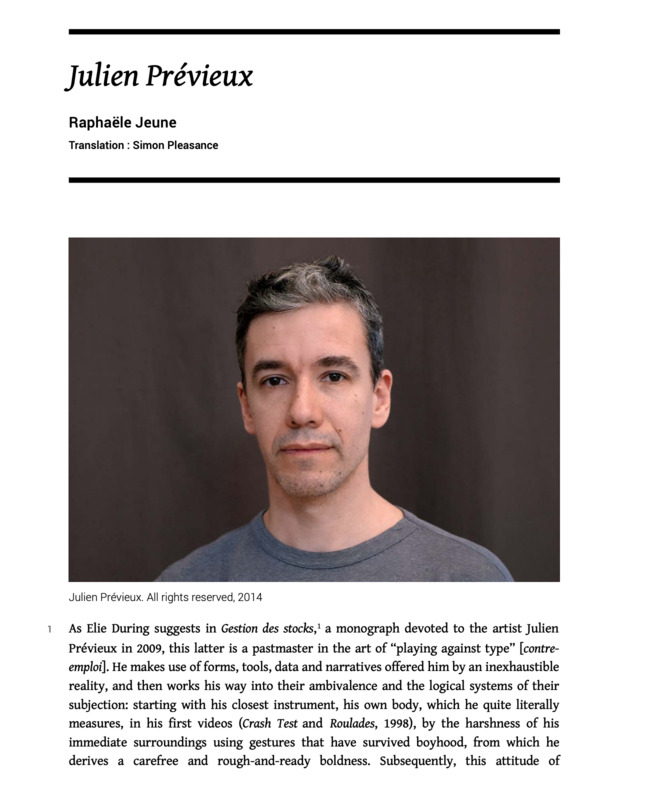- Julien Prévieux. All rights reserved, 2014 As Elie During suggests in Gestion des stocks, a monograph devoted to the artist Julien Prévieux in 2009, this latter is a pastmaster in the art of “playing against type” [contre-emploi]. He makes use of forms, tools, data and narratives offered him by an inexhaustible reality, and then works his way into their ambivalence and the logical systems of their subjection: starting with his closest instrument, his own body, which he quite literally measur...