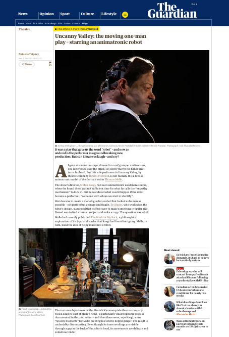 - https://www.theguardian.com/stage/2022/feb/21/robots-theatre-uncanny-valley-thomas-melle-electric-rosary-tim-foley