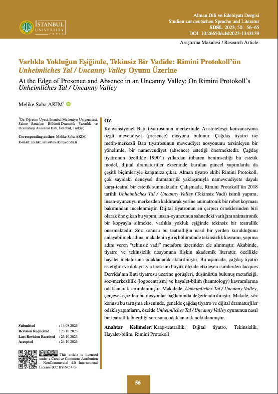 - <p>Conventional Western theatre is based on the Aristotelian notion of presence. Contemporary theatre, however, proposes an aesthetic of absence. Its orientation differs from the notion of presence found in text-centred Western theatre. This aesthetic model, adopted by contemporary theatre since the 1990s, also appears in various forms in current productions based on digital dramaturgies. Rimini Protokoll, a German theatre company with many experimental approaches, presents an anti-theatrical aesthetic based on absence. This study analyses Rimini Protokoll’s 2018 <em>Unheimliches Tal / Uncanny Valley</em> in terms of removing the human actor from the centre and replacing him with an animatronic robot. This production, which stands out as one of the most striking examples of digital theatre, erases the presence of the human actor on stage with an animatronic copy, proposing an uncanny theatricality that oscillates between presence and absence. To understand how this theatricality is constructed, the concept of the uncanny is analysed in the introductory part of the article through the metaphor of the “uncanny valley.” Subsequently, the academic literature on theatre and the notion of the uncanny is presented, with a particular focus on the metaphor of the ghost. The following section presents Jacques Derrida’s views onWestern theatre, focusing on his concepts of the metaphysics of presence, logocentrism, and hauntology. The article examines <em>Unheimliches Tal / Uncanny Valley</em> in the context of those concepts and then concludes with a consideration of the theatricality of this production in relation to contemporary theatre productions and digital dramaturgies.</p>