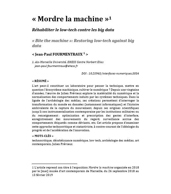 L’art peut-il constituer un laboratoire pour penser la technique, mettre en question l’écosystème machinique, cultiver le numérique ? Depuis une vingtaine d’années, l’œuvre de Julien Prévieux explore la matérialité du numérique et la normalisation des comportements induits par les systèmes techniques. Dans la lignée de l’archéologie des médias, ses créations permettent d’interroger la transformation du monde en données (notamment informatiques) et l’histoire ambivalente de la capture du mouvement, depuis ses origines scientifiques jusqu’à son instrumentalisation contemporaine par les institutions militaires ou du renseignement : optimisation et prescription des gestes d’interface, enregistrement des mouvements du regard, surveillance accrue des comportements étiquetés comme déviants, etc. Cet article propose d’examiner cette approche technocritique et statactiviste, à contre-courant de l’idéologie du progrès et de l’accélération de l’innovation.