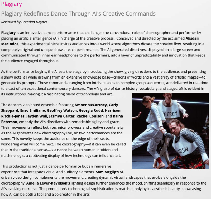 - Plagiary Plagiary Redefines Dance Through AI's Creative Commands Reviewed by Brendan Daynes Plagiary is an innovative dance performance that challenges the conventional roles of choreographer and performer by placing an artificial intelligence (AI) in charge of the creative process.. Conceived and directed by the acclaimed Alisdair Macindoe, this experimental piece invites audiences into a world