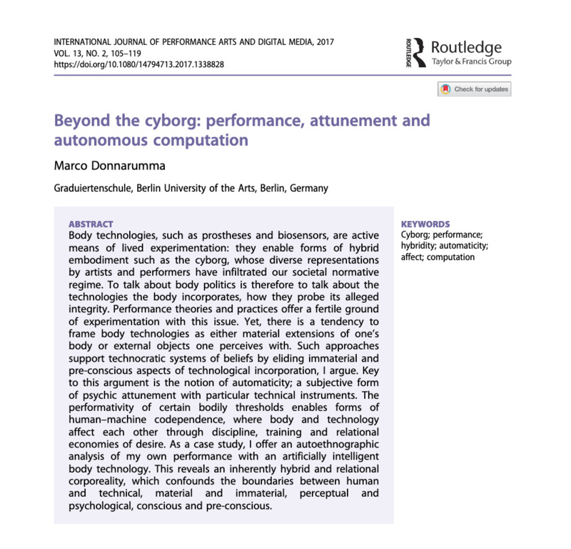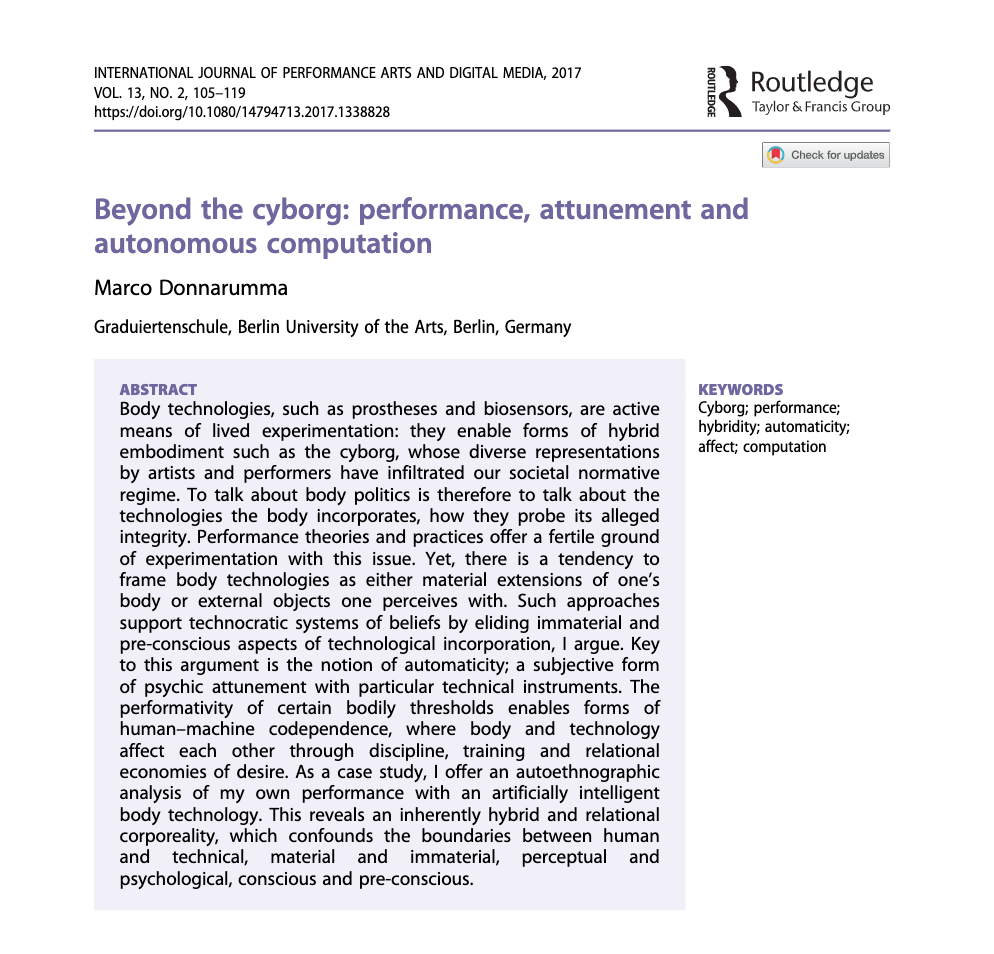 Body technologies, such as prostheses and biosensors, are active means of lived experimentation: they enable forms of hybrid embodiment such as the cyborg, whose diverse representations by artists and performers have infiltrated our societal normative regime. To talk about body politics is therefore to talk about the technologies the body incorporates, how they probe its alleged integrity. Performance theories and practices offer a fertile ground of experimentation with this issue. Yet, there is a tendency to frame body technologies as either material extensions of one’s body or external objects one perceives with. Such approaches support technocratic systems of beliefs by eliding immaterial and pre-conscious aspects of technological incorporation, I argue. Key to this argument is the notion of automaticity; a subjective form of psychic attunement with particular technical instruments. The performativity of certain bodily thresholds enables forms of human–machine codependence, where body and technology affect each other through discipline, training and relational economies of desire. As a case study, I offer an autoethnographic analysis of my own performance with an artificially intelligent body technology. This reveals an inherently hybrid and relational corporeality, which confounds the boundaries between human and technical, material and immaterial, perceptual and psychological, conscious and pre-conscious.