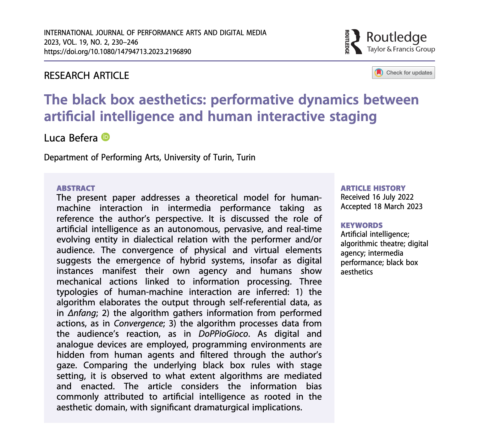 Zotero automatique tagger a taggé le document The Black Box Aesthetics: Performative Dynamics Between Artificial Intelligence and Human Interactive Staging avec le tag intermedia performance