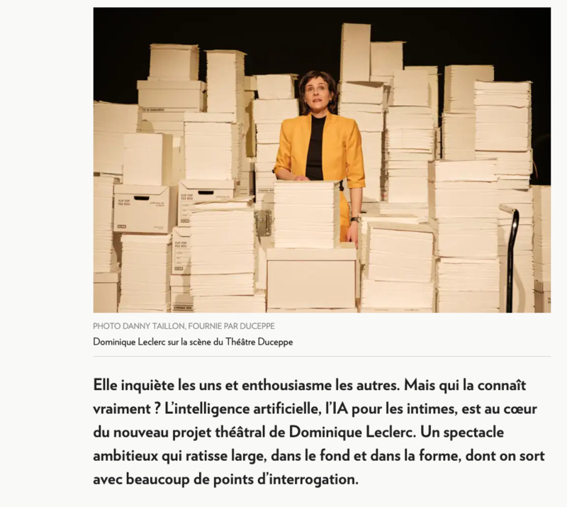 - Elle inquiète les uns et enthousiasme les autres. Mais qui la connaît vraiment ? L’intelligence artificielle, l’IA pour les intimes, est au cœur du nouveau projet théâtral de Dominique Leclerc. Un spectacle ambitieux qui ratisse large, dans le fond et dans la forme, dont on sort avec beaucoup de points d’interrogation.