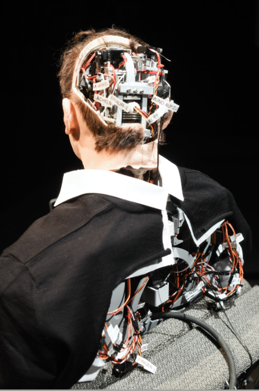 Uncanny Valley met en scène un double mécanique dont l’objectif n’est pas de tromper les spectateur.ices quand à la nature ontologique de ce qui se tient devant elleux, mais bien de les maintenir dans une oscillation constante entre identification et distanciation. Là où tant de créations robotiques poursuivent l’horizon d’un mimétisme parfait — ce rêve de rendre les machines indiscernables des humain.es —, le spectacle de Stefan Kaegi semble au contraire déjouer cette tentation. Il n’efface jamais les indices de la fabrication. En ce sens, l’androïde de Melle est présenté avec son crâne-hardware ouvert, laissant apparaître des circuits et des câblages, comme un rappel méthodique de son statut de machine. Certains dysfonctionnements (un œil qui ne cligne plus, un geste qui se fige) viennent renforcer cette conscience de l’artifice.