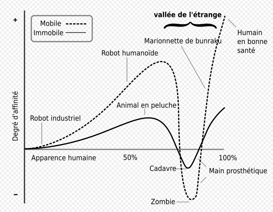 Formulée en 1970, la théorie de la Vallée de l’étrange de Mori Masahiro décrit le malaise que suscitent chez l’humain.e certaines figures artificielles dont l’apparence est presque, mais pas tout à fait, humaine. Selon Mori, plus un robot semble familier et anthropomorphe au yeux de l’humain.e qui le contemple, plus il lui inspire confiance. Cela dit, toujours selon Mori, lorsque le robot atteint une imitation imparfaite, le public peut ressentir de l’inquiétude et de l’étrangeté face à celui-ci. Ce point critique, que le roboticien japonais nomme l’Uncanny Valley, est occupé par des figures ambiguës : cadavres, zombies, prothèses, androïde trop vraisemblable. Au sommet de cette courbe trône une figure précise : une « personne en bonne santé », censée incarner le point d’ancrage de l’identification et de l’acceptabilité sociale. De ce fait, Mori établit alors comme repère ultime de la familiarité la « personne en bonne santé » – sans jamais préciser à quel modèle humain il se réfère. Or, comme le rappelle Jennifer Rhee (2018), ce référent soi-disant universel est en réalité un idéal normatif, un standard culturellement situé, qui marginalise toute personne s’écartant des normes conventionnelles. Cette normalité, loin d’être neutre, s’inscrit dans un régime capacitiste, où la déviation par rapport à un corps ou un comportement standardisé est perçue comme source d’étrangeté.