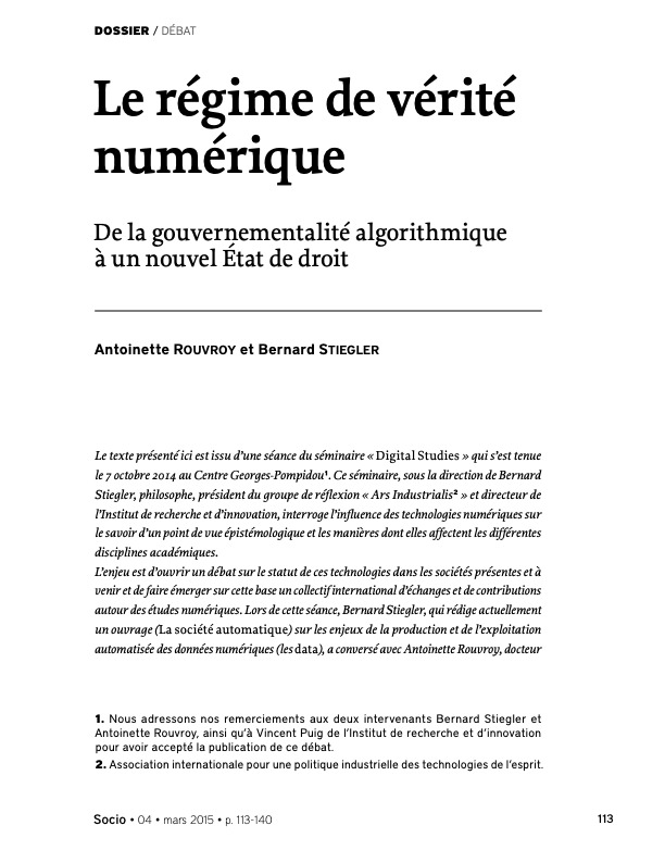 Items with "A comme contenu relié / annoté (ressource physique, actant, conceptuelle): Le régime de vérité numérique De la gouvernementalité algorithmique à un nouvel État de droit"