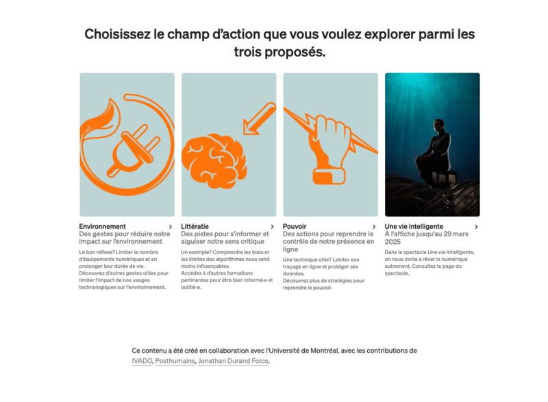 La pièce Une vie intelligente soulève d’importants enjeux sociétaux de l’IA et du numérique. Ça vous fait réagir? Vous voulez passer à l’action? Nous avons préparé pour vous une liste de trucs et conseils qui pourront vous aider à poser des gestes concrets.