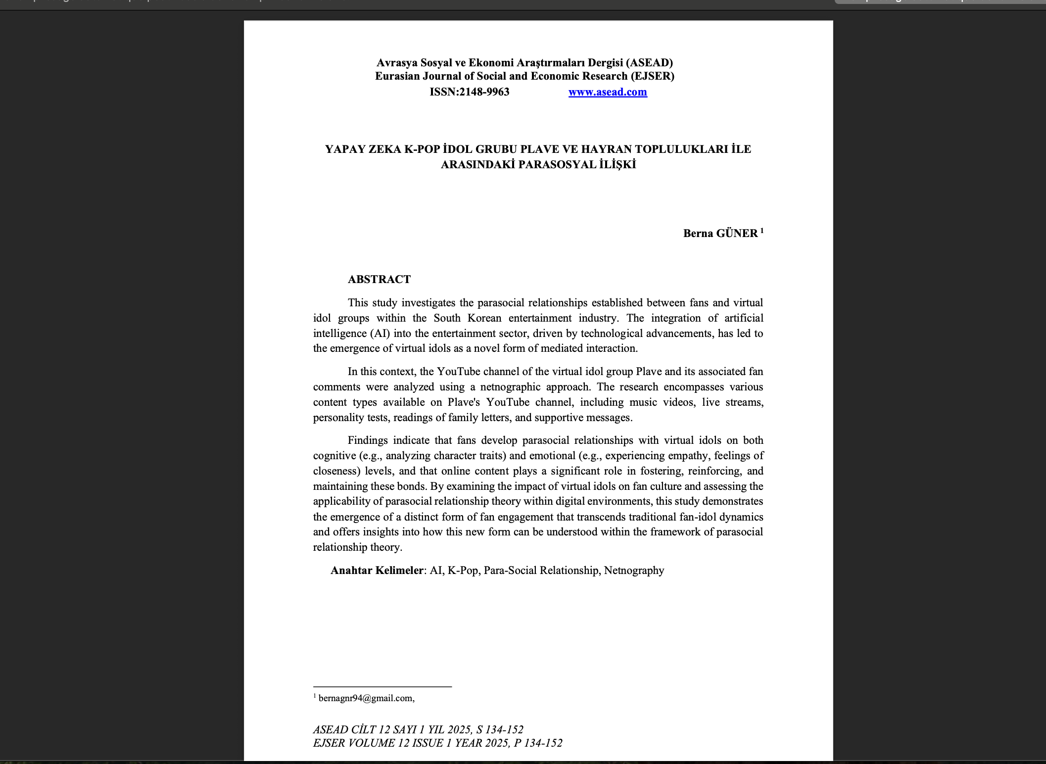 «Cette étude examine les relations parasociales établies entre les fans et les groupes d’idoles virtuelles dans l’industrie du divertissement sud-coréenne. L’intégration de l’intelligence artificielle (IA) dans le secteur du divertissement, portée par les avancées technologiques, a conduit à l’émergence des idoles virtuelles comme une nouvelle forme d’interaction médiatisée.