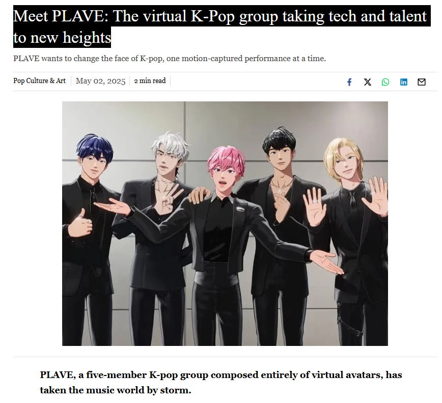 - Article présentant PLAVE, un groupe K‑pop composé de cinq avatars (Yejun, Noah, Eunho, Bamby, Hamin) animés en temps réel par capture de mouvement