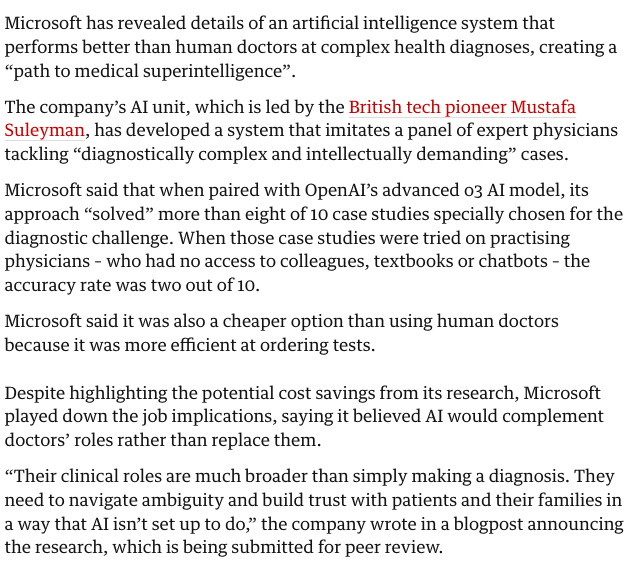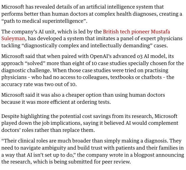 - Microsoft says AI system better than doctors at diagnosing complex health conditions