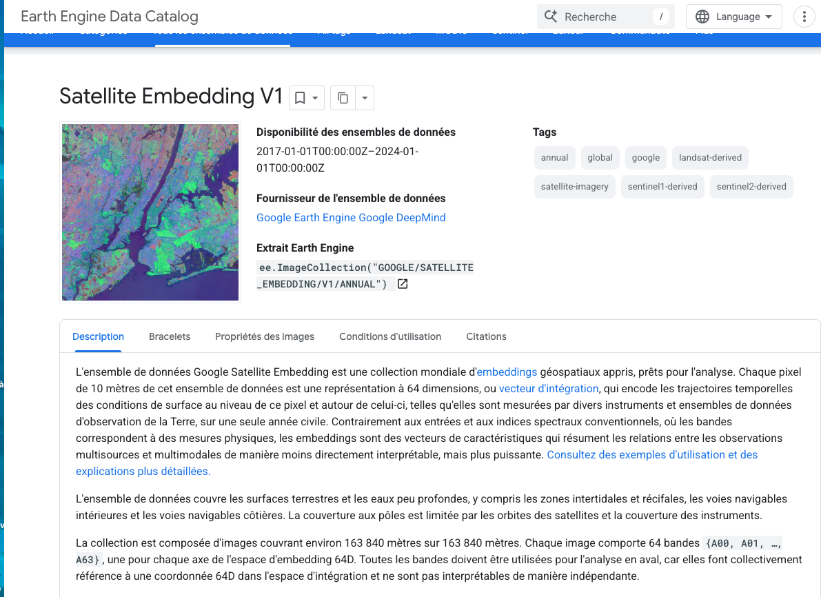 - https://developers.google.com/earth-engine/datasets/catalog/GOOGLE_SATELLITE_EMBEDDING_V1_ANNUAL?hl=fr