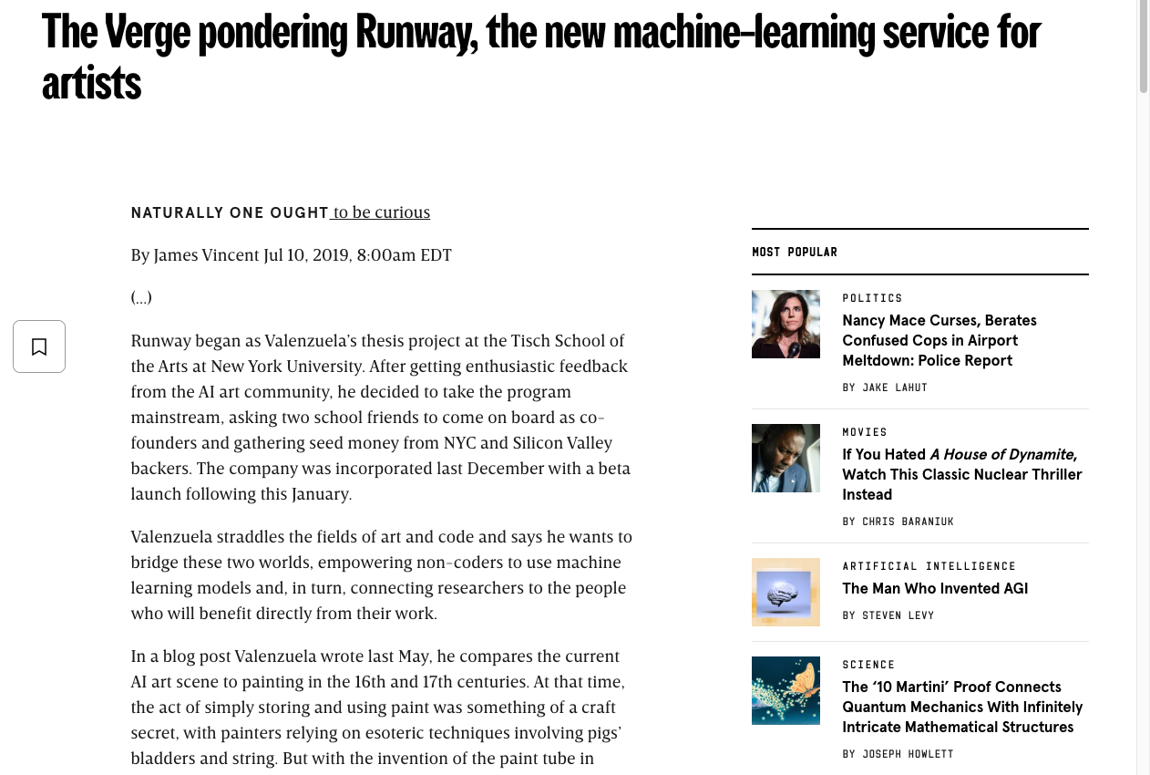 - https://www.wired.com/beyond-the-beyond/2019/07/verge-pondering-runway-new-machine-learning-service-artists/