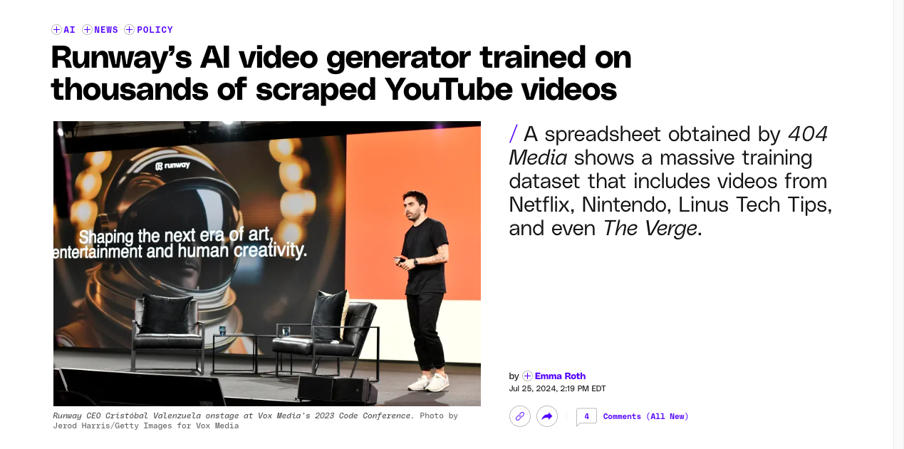 - https://www.theverge.com/2024/7/25/24206120/runway-ai-video-generator-scraped-youtube-videos-report