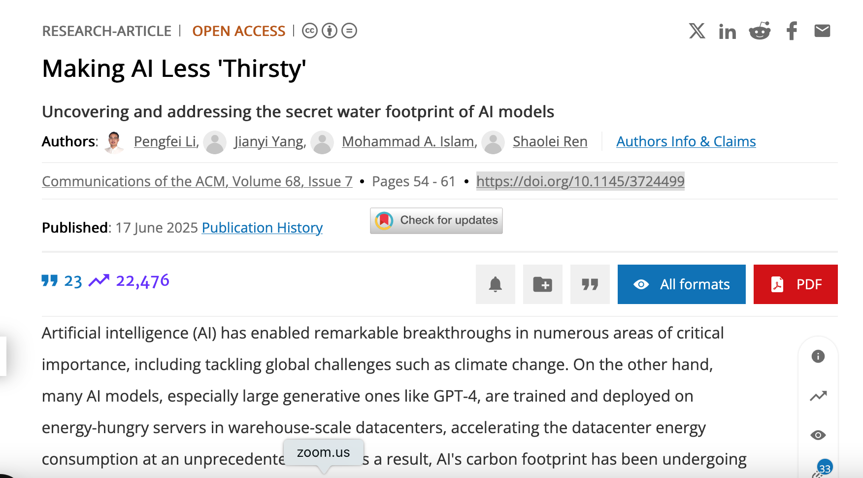Items with "Ressource(s) associée(s) (ressource physique, actant, conceptuelle): Making AI Less "Thirsty": Uncovering and Addressing the Secret Water Footprint of AI Models"