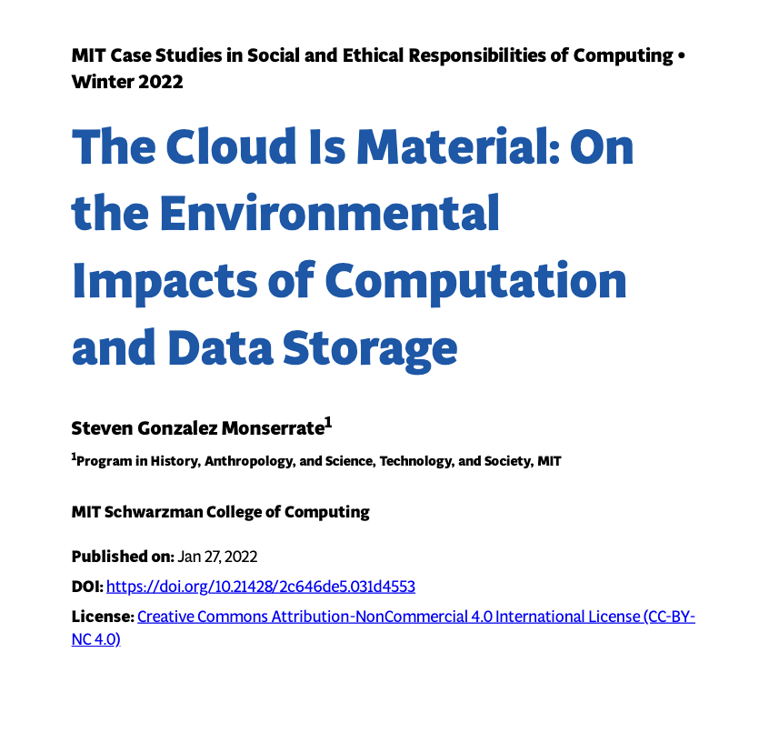 - The Cloud Is Material: On the Environmental Impacts of Computation and Data Storage